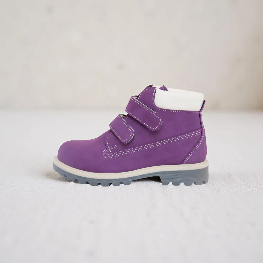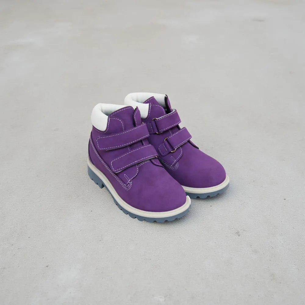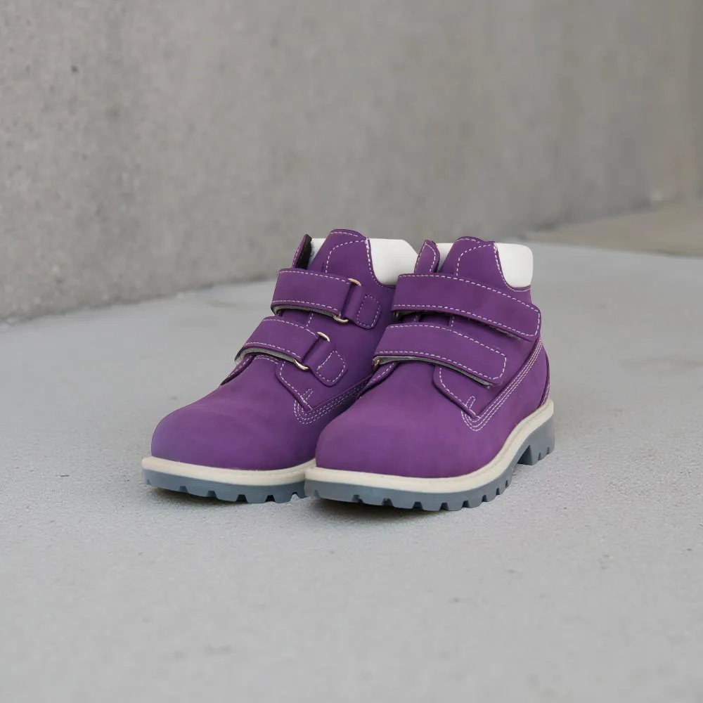 زوج من الأحذية عالية الكاحل للأطفال، شاموا، باللون الأرجواني. أحذية خفيفة الوزن، مانعة للإنزلاق، سهلة الارتداء،مريحة. جيد التهوية بتصميم أنيق وعضري وبسيط. مادة النعل من المطاط، ممايوفر مقاومة ممتازة للاحتكاك. مناسب لمختلف الأنماط والأزياء.