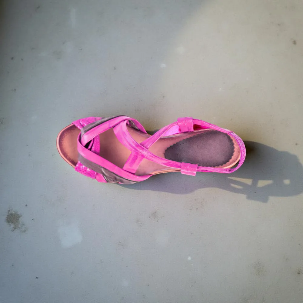 حذاء نسائي كاجوال، بكعب عالي وسميك، بفتحة للأصابع. يتميز بوجود حلي معدني في بدايته باللون الأحمر، مناسب لأيام الصيف. احصلي على مظهر أنيق، بحذاء نسائي كاجوال، كعب عالي، برباط. وامنحي مظهرك بريقاً، واختاري أحذية بتصاميم مميزة، باللونين الوردي والأحمر. اختاري هذه المنتجات، وتألقي أثناء العطلة الصيفية.